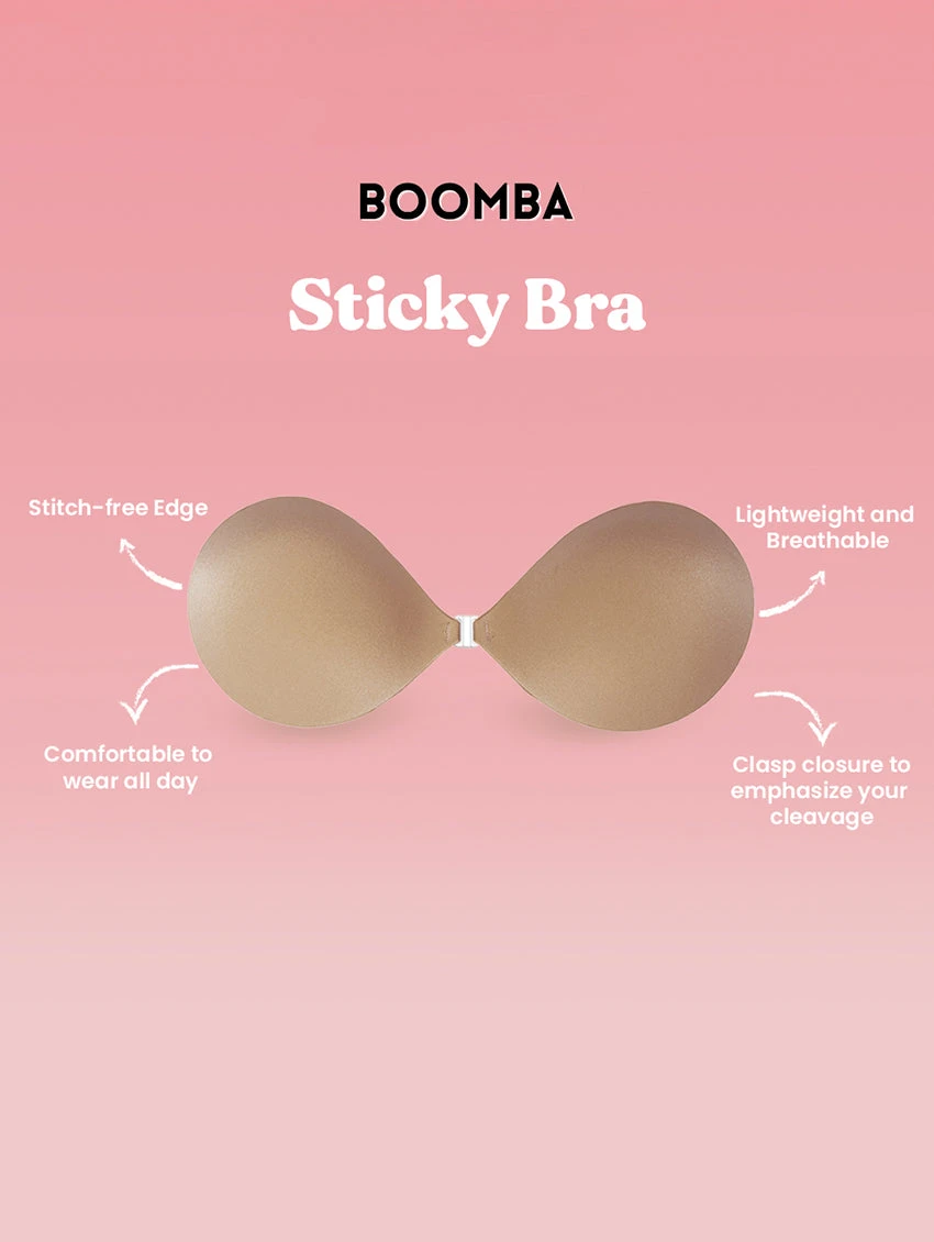 - To remove: unclasp and gently peel off one cup at a time, starting from the top outer edge. Reapply protective films onto the sticky bra and store back into the Boomba gift box, away from direct sunlight.