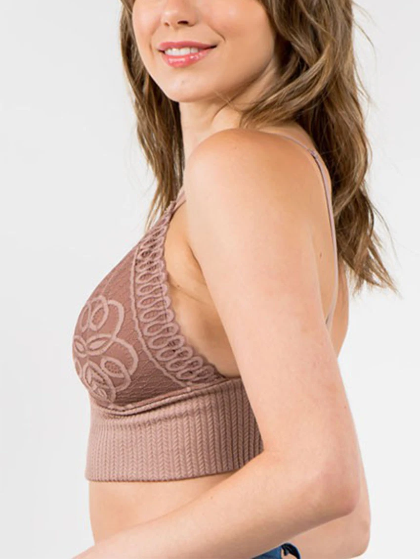 Mya is a comfort bralette that’s been seriously upgraded with gorgeous lace detailing. This longline style has a deep V-neck, triangle style cups, and removable padding. The adjustable straps add some lift while the pull over style keeps it comfy for lounging or long time wear.
